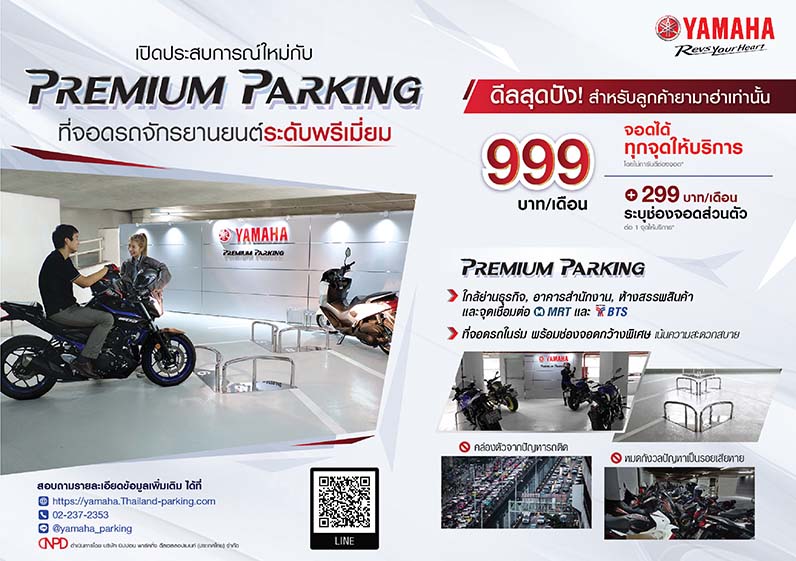 โดยลูกค้ายามาฮ่าที่สนใจใช้บริการ YAMAHA PREMIUM PARKING สามารถลงทะเบียนผ่านช่องทางออนไลน์ที่ http://yamaha.thailand-parking.com เพื่อใช้บริการที่จอดรถสุดพรีเมียม 9 แห่งได้แล้ววันนี้ พร้อมด้วยโปรโมชั่นสุดพิเศษด้วยค่าบริการเพียง 999 บาท/เดือน หรือจ่ายเพิ่ม 299 บาท/เดือน เพื่อจับจองช่องจอดประจำส่วนตัว