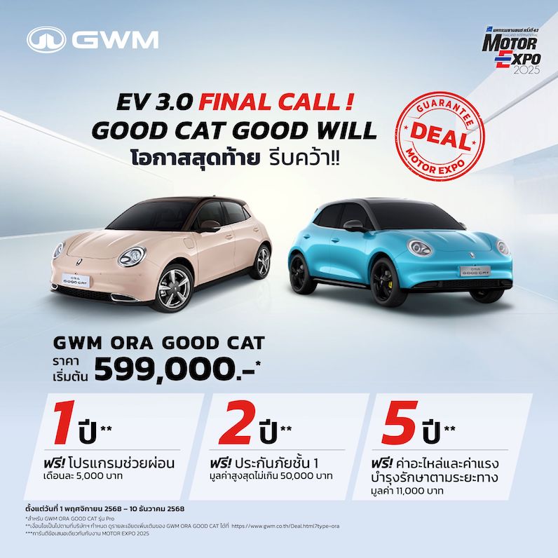 แคมเปญ Good Cat Good Will เป็นข้อเสนอสุดพิเศษกับโอกาสสุดท้ายในการเป็นเจ้าของ GWM ORA Good Cat ภายใต้มาตรการสนับสนุนการใช้รถยนต์ไฟฟ้าหรือ EV 3.0