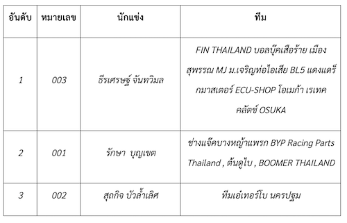 แชมป์ประจำปีคือ คุณธีรเศรษฐ์ จันทวิมล หมายเลข 003 ทีม FIN THAILAND บอลบุ๊คเสือร้าย เมืองสุพรรณ MJ ม.เจริญท่อไอเสีย BL5 แดงแดร็กมาสเตอร์ ECU-SHOP โอเมก้า