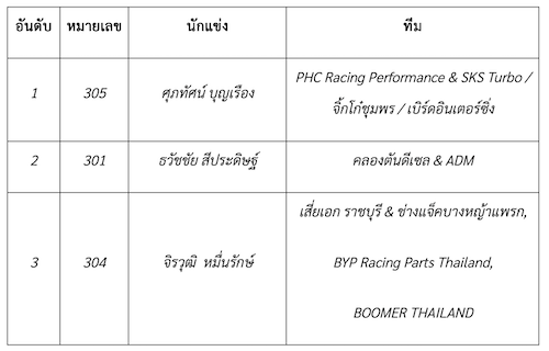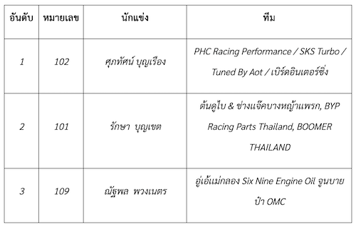 แชมป์ประจำปีคือ ศุภทัศน์ บุญเรือง หมายเลข 102 จากทีม PHC Racing Performance / SKS Turbo / Tuned By Aot / เบิร์ดอินเตอร์ซิ่ง