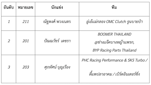 แชมป์ประจำปีคือ ณัฐพงศ์ พวงเนตร หมายเลข 211 จากทีม อู่เอ้เเม่กลอง OMC Clutch จูนบายป๋า