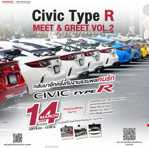 ในกิจกรรม Honda Civic Type R Fan Meet #2: The Unrivaled Performance ในวันเสาร์ที่ 14 มีนาคม 2569 ณ ศูนย์ฝึกขับขี่ปลอดภัยฮอนด้า ถนนรามคำแหง