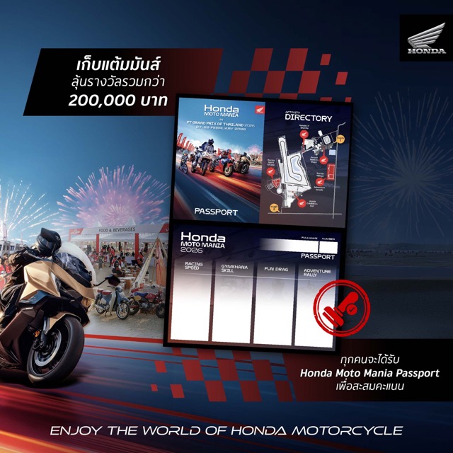 ไทยฮอนด้า ชวนแฟนสองล้อร่วมปลุกความมันส์ในงาน “Honda Moto Mania 2026” ที่ชวนมา Enjoy The World of Honda Motorcycle สัมผัสโลกมอเตอร์สปอร์ตครบทุกมิติ ทั้งการแข่งขัน ความรู้ และความสนุกในพื้นที่เดียว ระหว่างวันที่ 27–28 กุมภาพันธ์ 2569 ณ BRIC Drift Track สนาม Chang International Circuit จังหวัดบุรีรัมย์ ภายในงาน PT Grand Prix of Thailand 2026 เปิดรับสมัครแล้วผ่าน Honda BigWing และ Wing Center ทั่วประเทศ