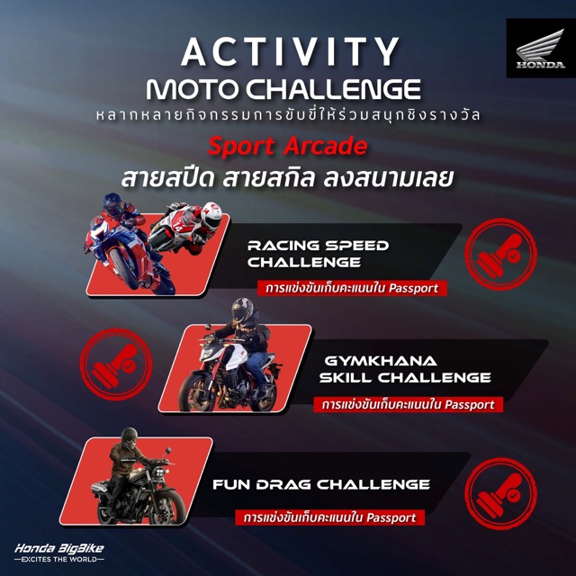 Gymkhana Skill Challenge ทดสอบทักษะควบคุมรถในสนามเทคนิคด้วย Honda CB500F (รถจาก Thai Honda)คูปอง 1 ใบ ลงแข่งได้ 1 ครั้ง แข่งขันทั้งหมด 2 รอบสนาม/ครั้ง จัดอันดับจากเวลารวมดีที่สุด ผู้ที่ทำเวลารวมได้เร็วที่สุด 3 อันดับ จะได้รับเงินรางวัล และของรางวัล โดยเก็บคะแนนใน Honda Passport